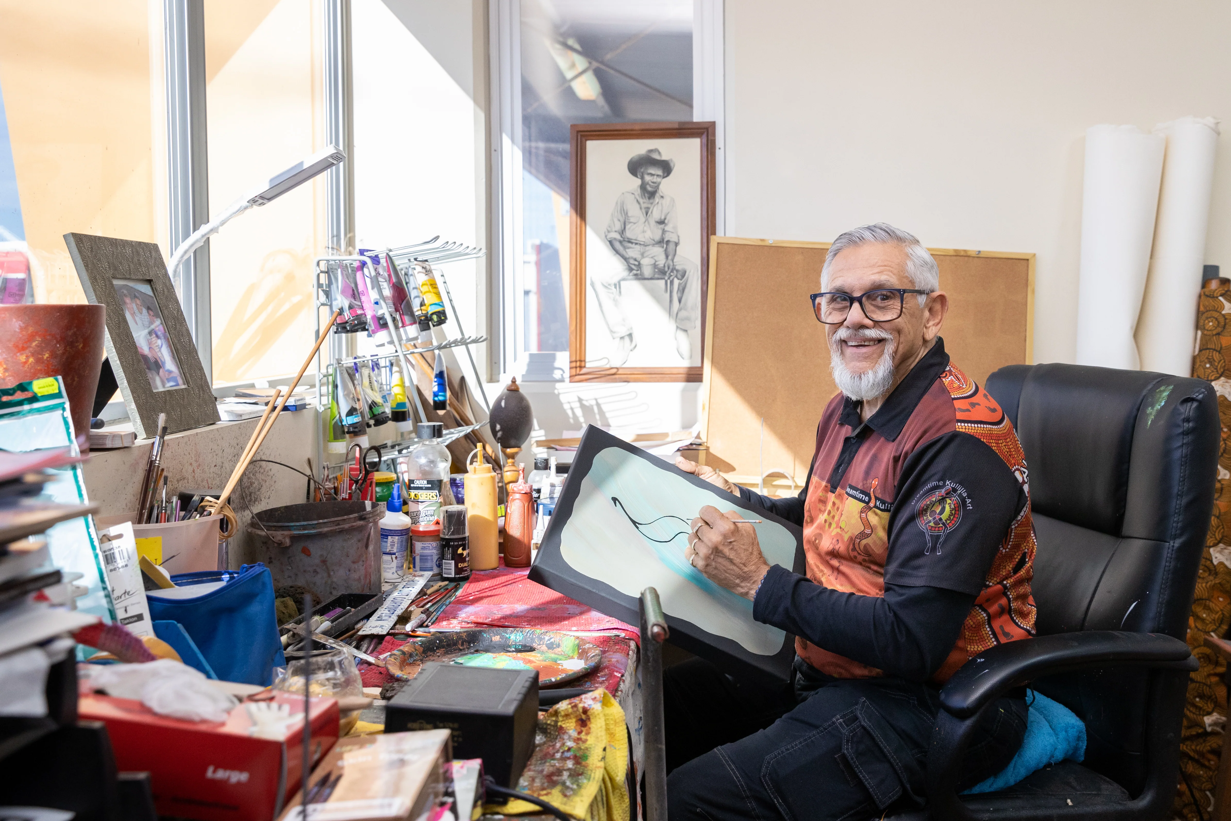 Michael Connolly is an Aboriginal from Charleville, south west Queensland and a descendant of the KullillI Tribe from the Thargomindah and Eulo region on his Father's side and from the Muruwari People from Goodooga and Brewarrina region of north-west New South Wales on his Mother's side who can trace their traditional trade and diplomatic links with Central Desert as well as South Australian and Northern New South Wales' Aboriginal Communities. With this rich Indigenous background and a unique way of interpreting his cultural heritage Michael is able to represent a unique perspective in the visual and performing arts that informs his significant work in cross cultural contexts