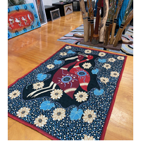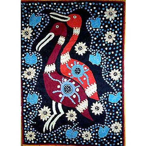 Tobwabba Art tells the story of the Worimi Community located in Forster, Tuncurry NSW. This beautiful chainstich rug is fully licenced and designed by Leslie Kelly " Water Hen and Wild Lily Flowers".