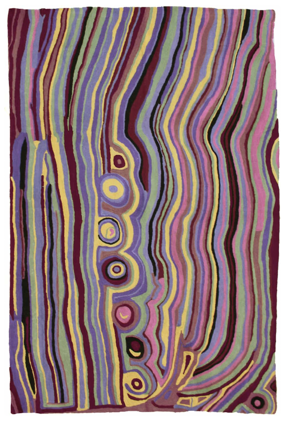 These beautiful, unique rugs are a cross-cultural collaboration combining Aboriginal designs and traditional Kashmiri rug-making techniques. Chain stitched, using hand dyed wool and finished with a heavy cotton backing, each rug is a completely handmade piece. This project is unusual because the rug is owned by the artists, rather than licensed to a third party. A more empowering way to work, this brings many direct benefits to the artists’ and their community. Control and ownership of intellectual property are also maintained. Purchase of these rugs guarantees a direct return to the Aboriginal artist and their community.