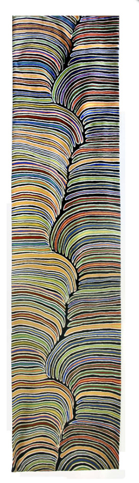 These beautiful, unique rugs are a cross-cultural collaboration combining Aboriginal designs and traditional Kashmiri rug-making techniques. Chain stitched, using hand dyed wool and finished with a heavy cotton backing, each rug is a completely handmade piece. This project is unusual because the rug is owned by the artists, rather than licensed to a third party. A more empowering way to work, this brings many direct benefits to the artists’ and their community. Control and ownership of intellectual property are also maintained. Purchase of these rugs guarantees a direct return to the Aboriginal artist and their community.