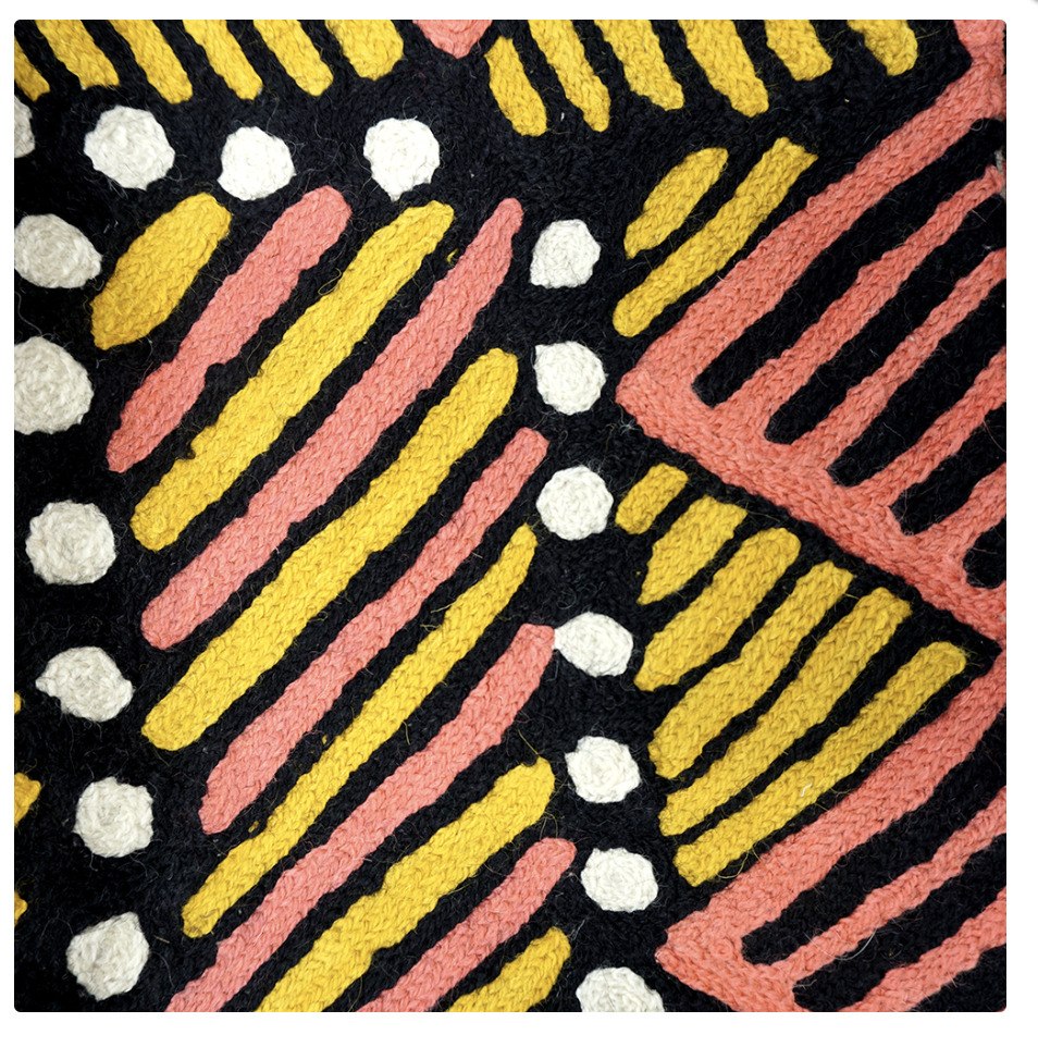 These beautiful, unique rugs are a cross-cultural collaboration combining Aboriginal designs and traditional Kashmiri rug-making techniques. Chain stitched, using hand dyed wool and finished with a heavy cotton backing, each rug is a completely handmade piece. This project is unusual because the rug is owned by the artists, rather than licensed to a third party. A more empowering way to work, this brings many direct benefits to the artists’ and their community. Control and ownership of intellectual property are also maintained. Purchase of these rugs guarantees a direct return to the Aboriginal artist and their community.