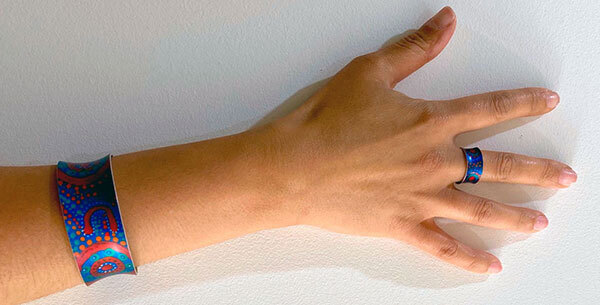 The bangles are made from 1mm thick and 25mm wide anodised aluminium. The bangles are medium in size with a diameter of approx 61mm and an opening of 32mm. They can be slightly bent to achieve a smaller or larger size. They are shipped gift boxed.
