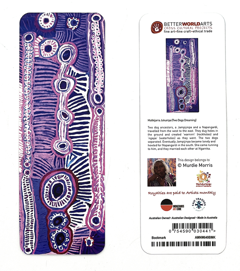 In this Dreaming story, two dog ancestors, a Jampijinpa and a Napangardi, travelled from the west to the east. At Tapu (a rockhole), the two dogs separated. The female dog, Napangardi, went to the south. The male dog, Jampijinpa, went to the north. Eventually he became lonely and howled for Napangardi in the south. She came running to him, and they married each other at Ngarnka. They wore men’s and women’s marriage headdresses, and Jampijinpa painted himself with white clay for the ceremony. The two dogs continued running east, before arriving in Warlaku (Ali Curung). Many other dogs were living in Warlaku when they arrived. There were many families of dogs, mothers and fathers and children and uncles all living together. Jampijinpa and Napangardi made a burrow to rest in and started a big family of dogs there. They chose to stay in Warlaku and live with all the other dogs. In this way, the ‘malikijarra Jukurrpa’ (two dogs Dreaming) tells the story of proper conduct in families and marriages.