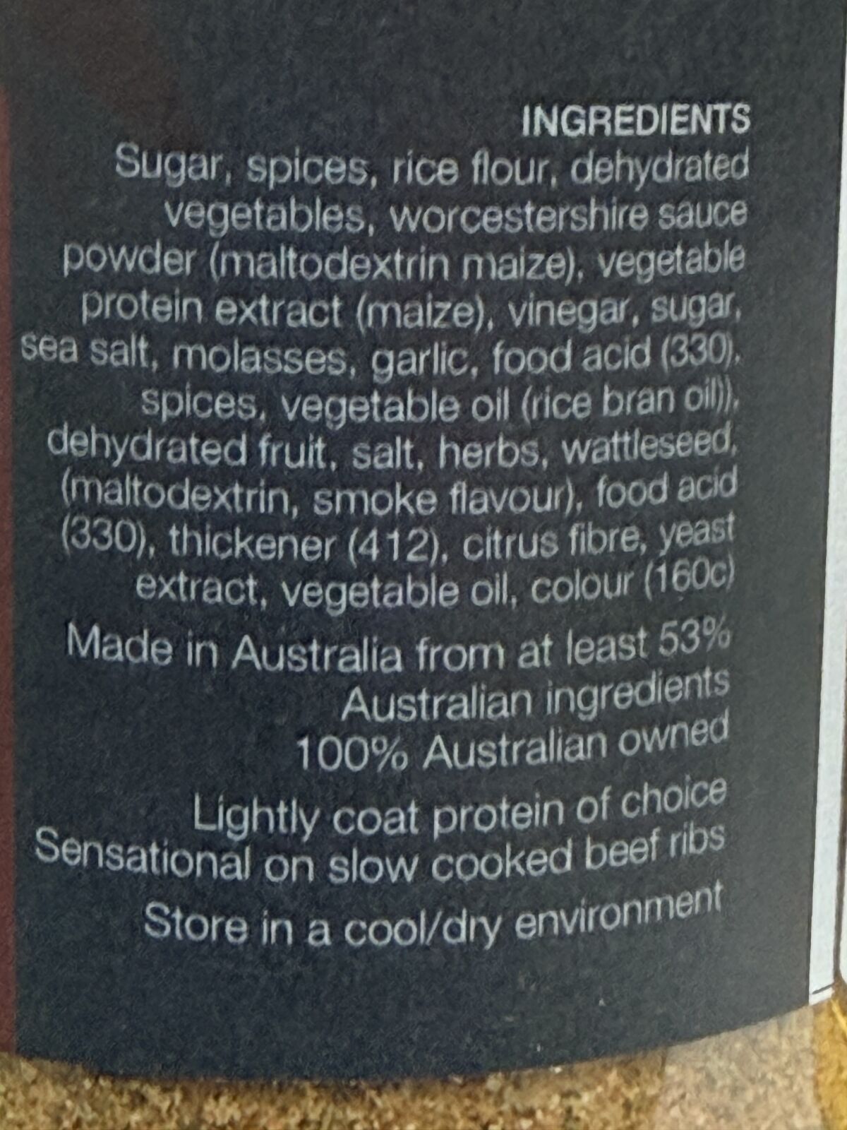 Ingredients: sugar; rice flour; salt; spices; chipotle chilli; herbs; vegetables; honey; Worchester Sauce; rice bran oil; vinegar; molasses; yeast extract; fruit food acid (330) spice extract