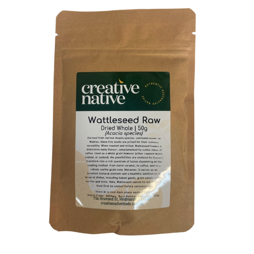 Derived from various Acacia species, commonly known as Wattles, these tiny seeds are prized for their culinary versatility. When roasted and milled, Wattleseed boasts a distinctive nutty flavour, complemented by subtle notes of coffee. Used as a whole grain however (either roasted whole, malted, or cooked), the possibilities are endless! Its flavours transform into a rich spectrum of tastes depending on the cooking method- from burnt caramel, to coffee, and to a robust, earthy grain note. Moreover, it serves as an excellent textural element and a healthful addition to an array of dishes, including baked goods, grain salads, soups, curries and more. Note, Wattleseed cannot be eaten raw, it must first be cooked before consumption.