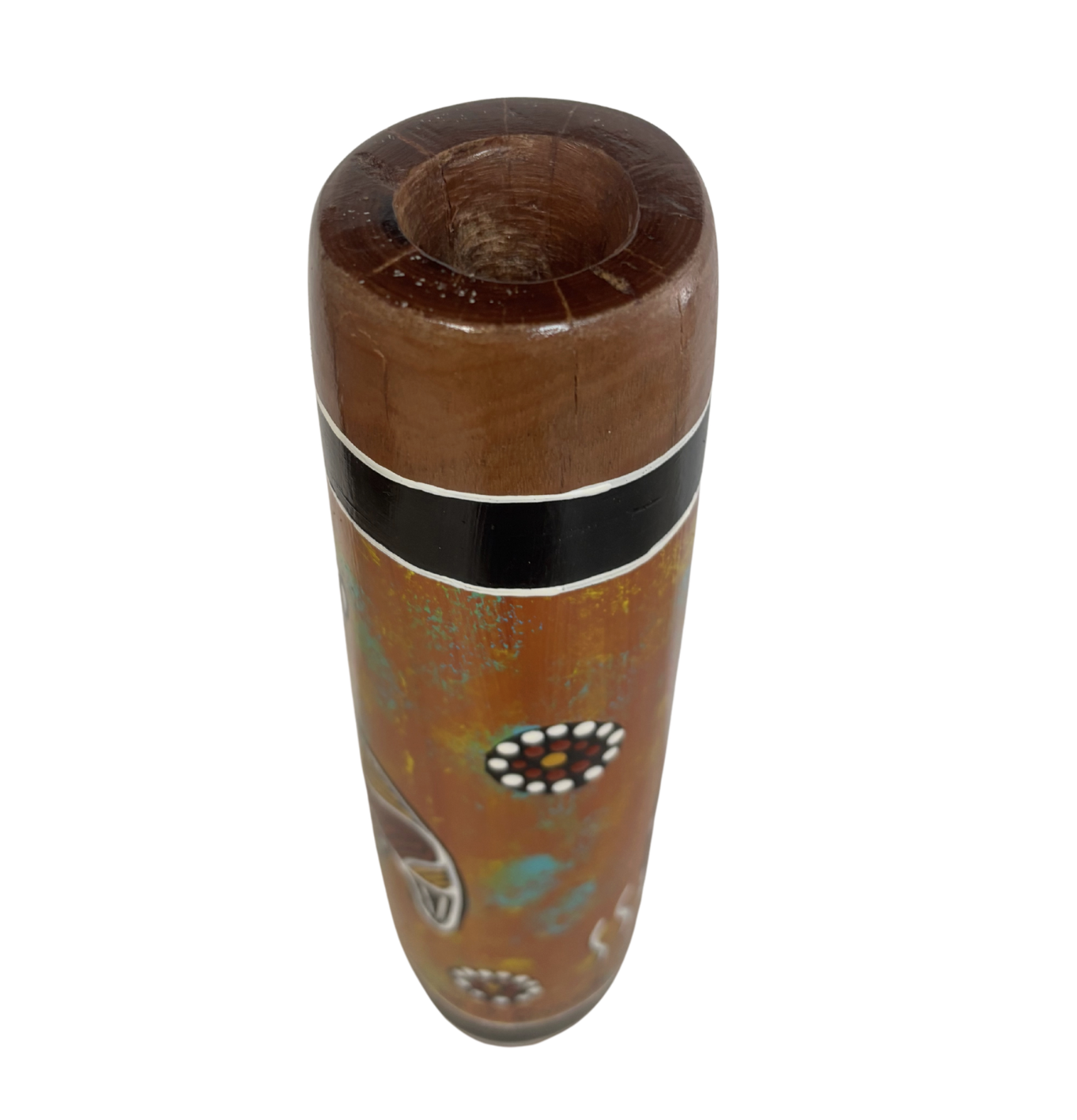 Emu callers are a musical instrument and hunting tool made from a hollowed-out piece of wood, often decorated short. They are about 30 cm long and look a little like didgeridoos. The emu callers were traditionally used by Aboriginal people when hunting. Just tap your open palm on the hollow end and you will hear the sound of an emu