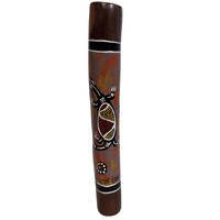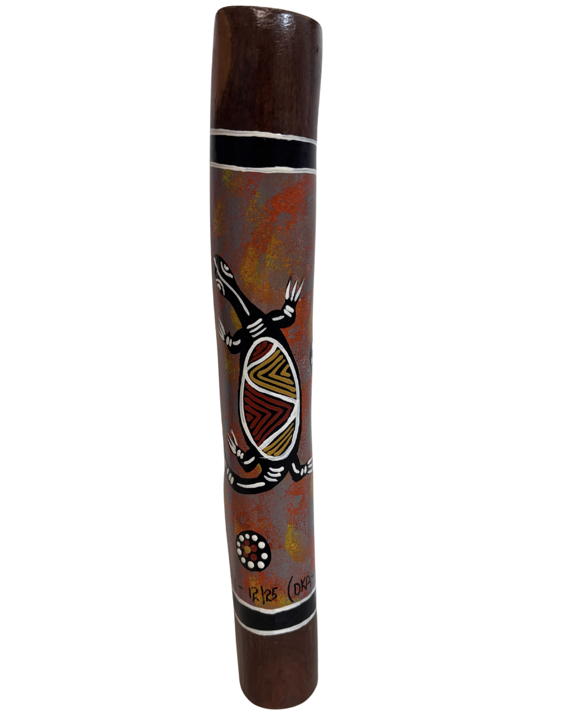 Emu callers are a musical instrument and hunting tool made from a hollowed-out piece of wood, often decorated short. They are about 30 cm long and look a little like didgeridoos. The emu callers were traditionally used by Aboriginal people when hunting. Just tap your open palm on the hollow end and you will hear the sound of an emu