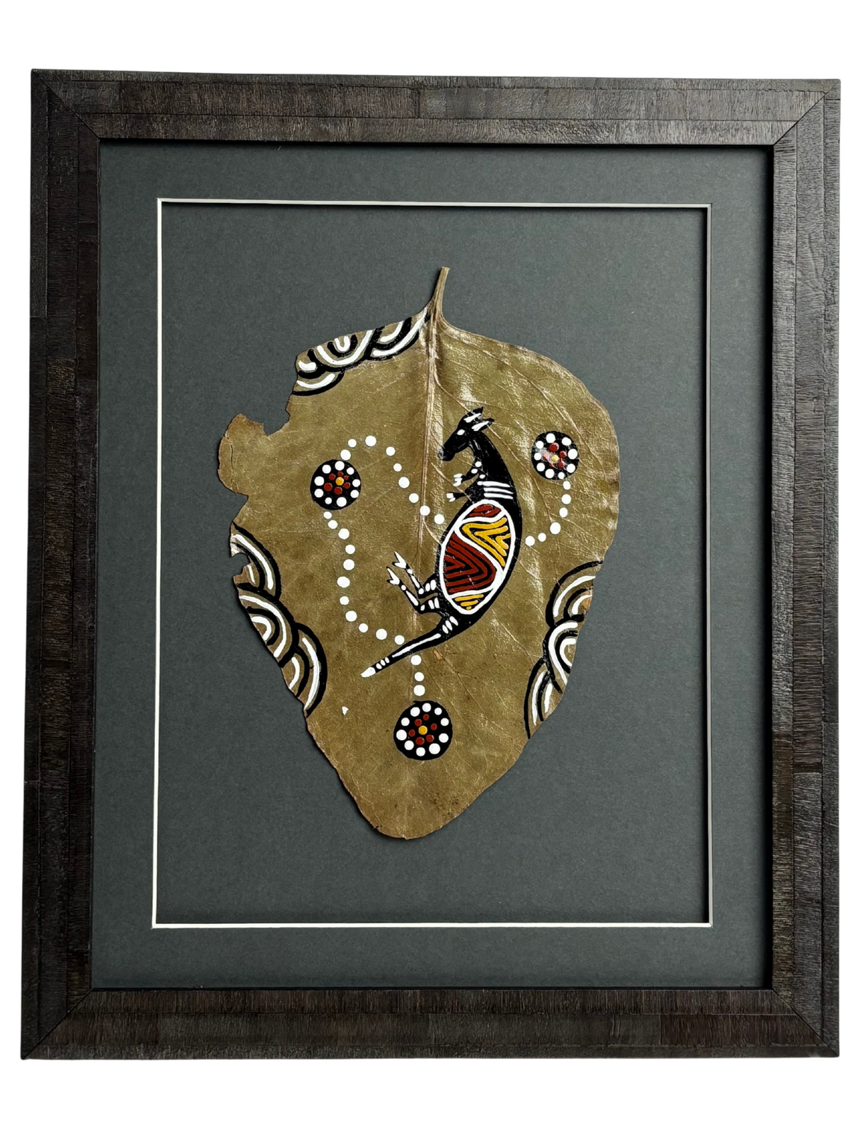 this is a real gumleaf handpicked and dried out and pressed for painting using Dot Art and Xhatching style Aboriginal Art