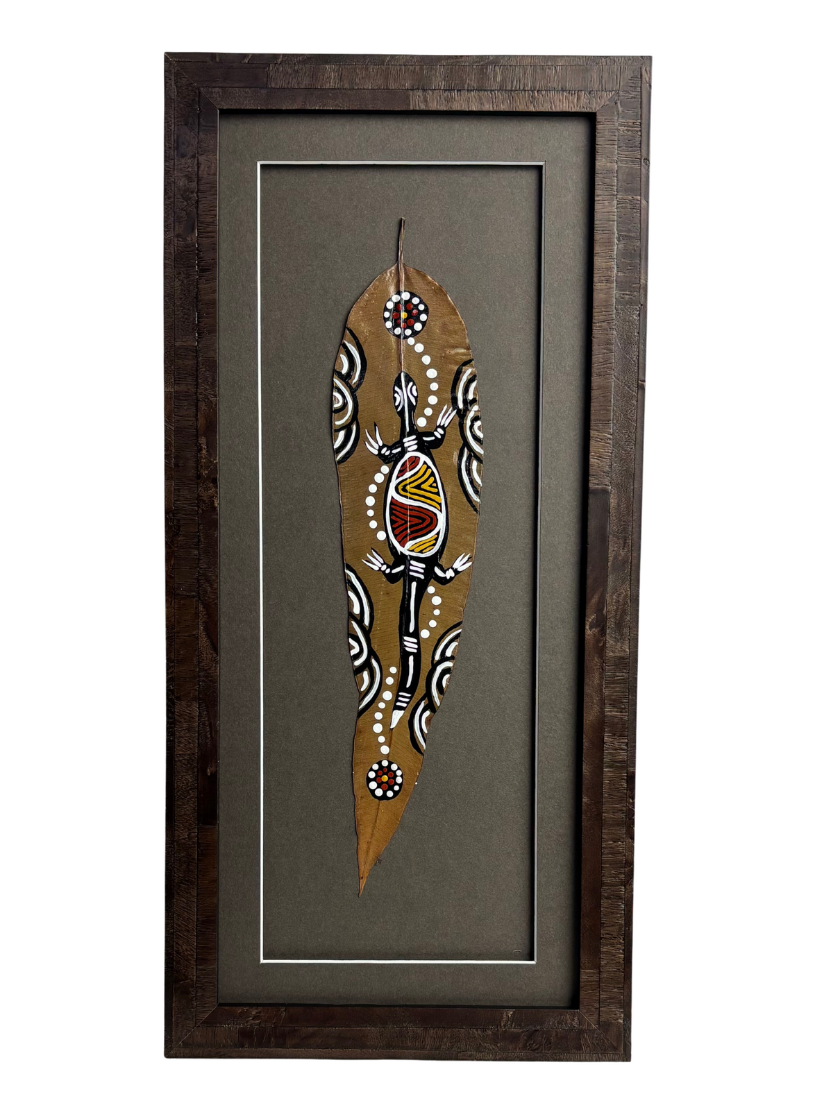 Framed Aboriginal Dot Art Handpainted Gumleaf (44cm x 21cm) - Lizard (Taupe)