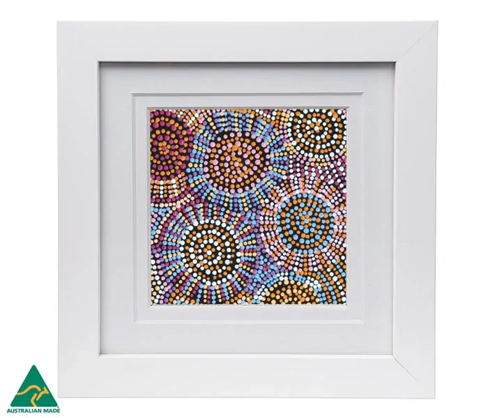 Framed print (reproduced under license) featuring artwork by Tina Martin from Warlukurlangu Artists. Established in 1985 Warlukurlangu Artists Aboriginal Corporation is a not-for-profit organisation that is 100% Aboriginal-owned by its artists from the r