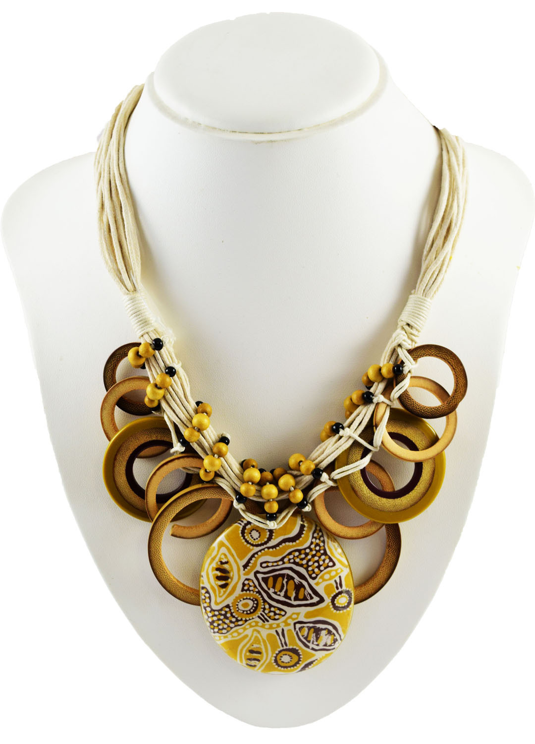 10 poly-resin timber circles threateded on a 15pce raw chord with metal clasp