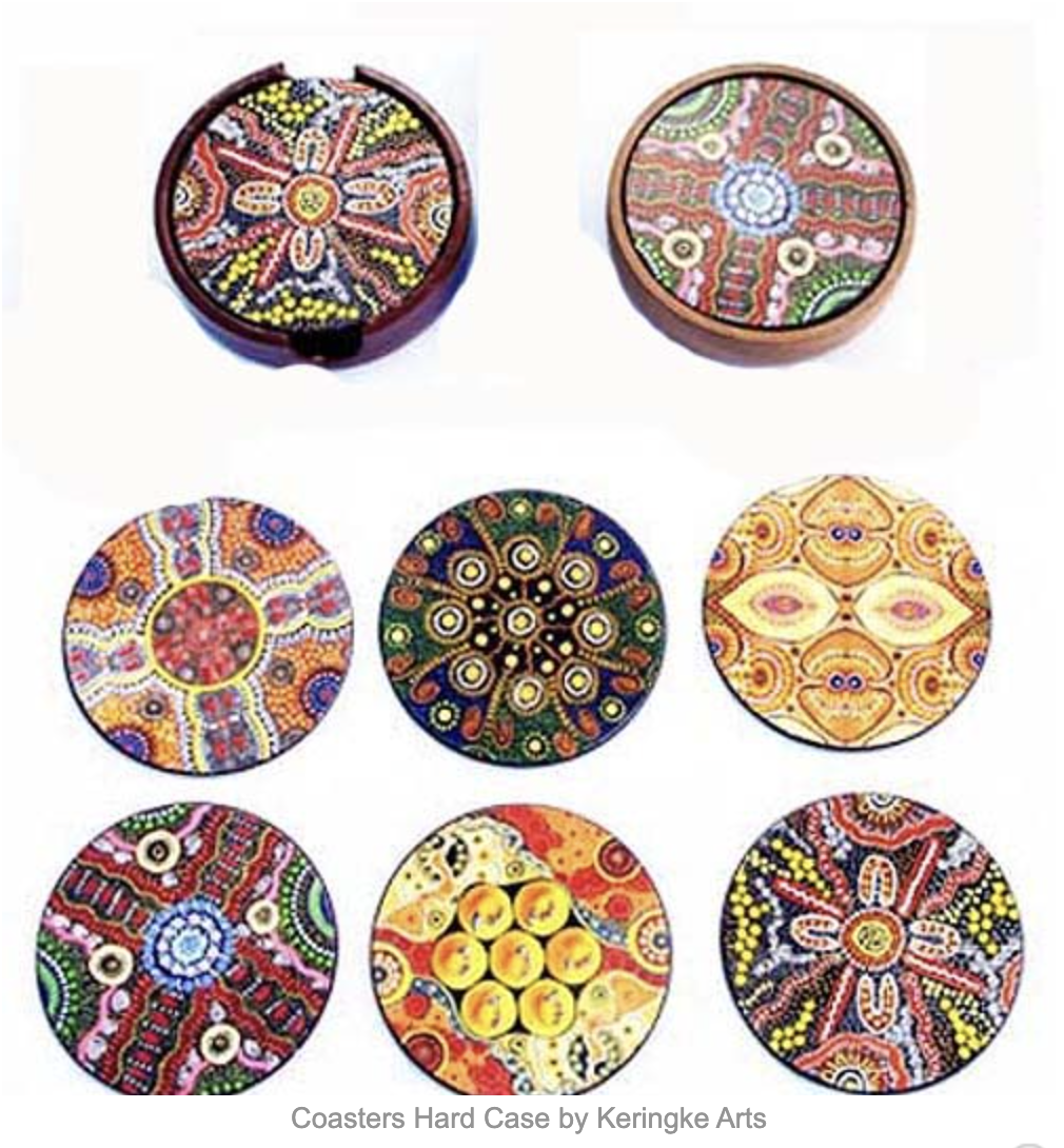 Set of six coasters depicting designs from Keringke Arts from Santa Teresa in Central Australia.