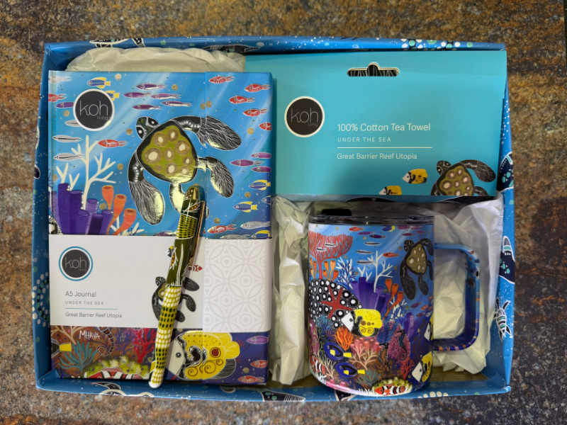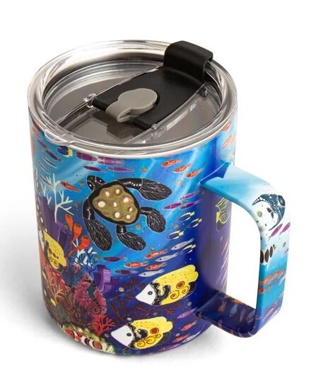 Utopia Design. "Utopia Great Barrier Reef" by celebrated Aboriginal artist Melanie Hava. The collection captures the mystical allure of the ocean, inspired by Melanie's lifelong fascination with marine life and her cultural connection to The Great Barrier Reef. Ever since her childhood fascination with the little mermaid's tale, Melanie has been entranced by the mysteries of the ocean. Her art piece, "Utopia Great Barrier Reef," is a deeply personal expression of her love for the underwater world, enriched by her cultural roots. As she puts it, "I love to indulge my imagination with scenes of the Great Barrier Reef, a truly underwater utopia land full of beautiful fishes and creatures." This design bring a piece of the underwater utopia into your everyday life. The travel mugs and water bottles are perfect companions for your journeys, adorned with Melanie's vibrant depictions of marine life