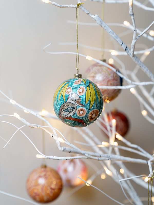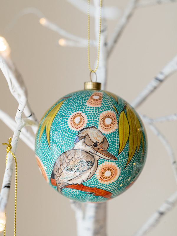 This piece shows a Kookaburra sitting in a Gum Tree looking out over all the meeting spots on country. He looks over the ceremonies and healing that takes place here and watches as the community come together in celebration.