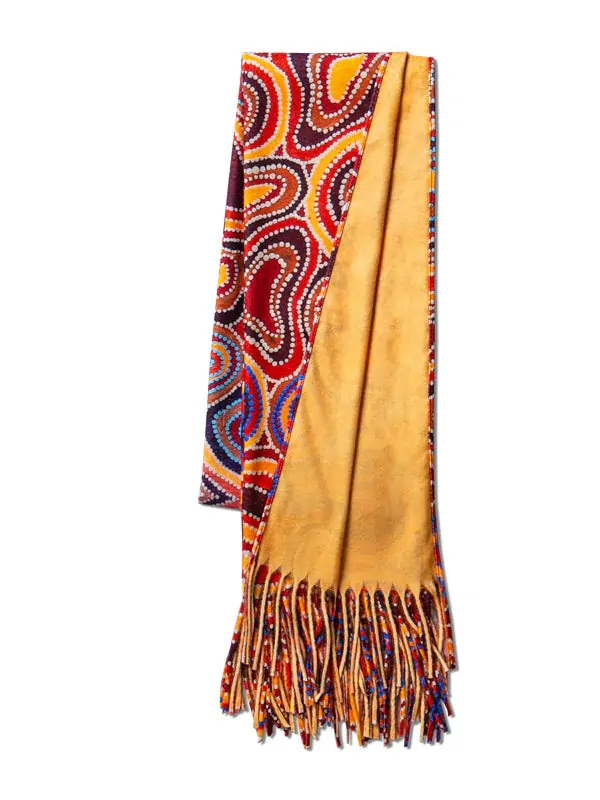 Embrace the beauty of Aboriginal art and storytelling with Dry Waterholes Scarf, featuring breathtaking artwork by First Nations artist Sheryl Hicks. Crafted from soft & smooth luxurious cashmere feel fabric, it provides both warmth and style, making it a perfect accessory to complement any outfit while celebrating Indigenous culture and the splendour of the Australian wilderness.