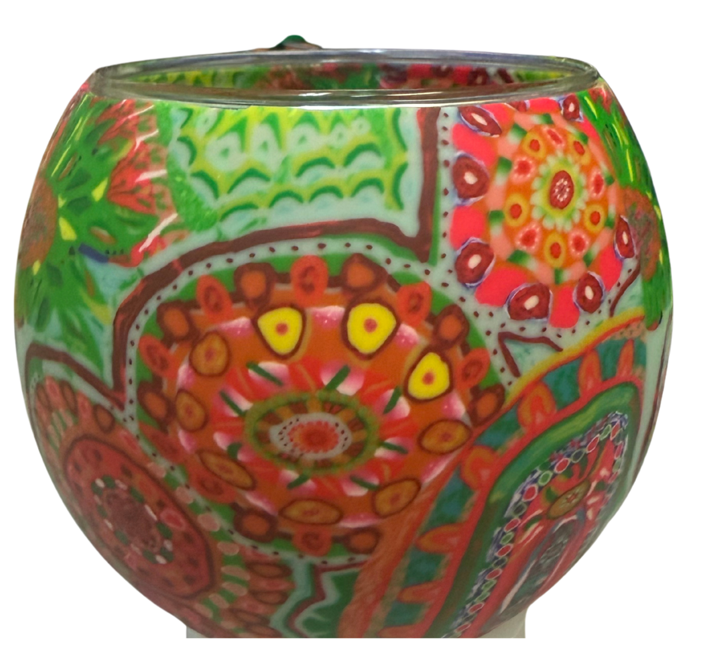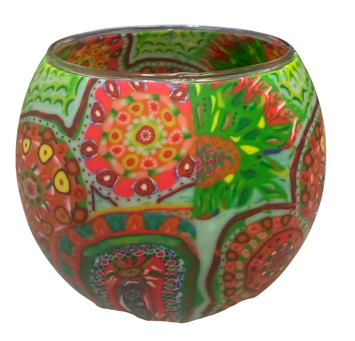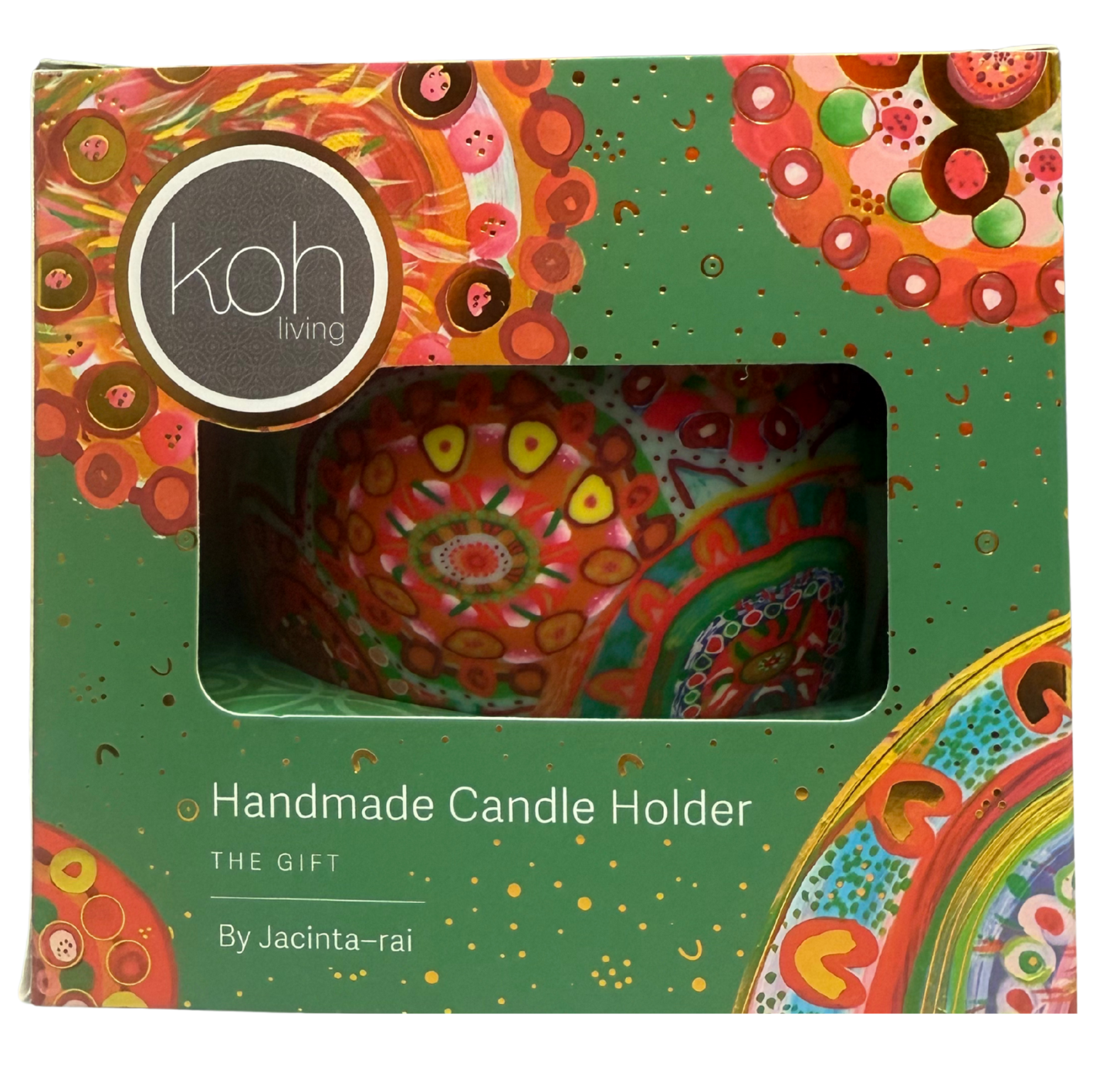 This Women's Dreaming candle holder is hand-made from glass and a layer of clay then beautifully gift boxed with a story card inside. The clay allows the candle flame to illuminate through and radiate the magnificent colours of the designs, captivating any space when using tealights