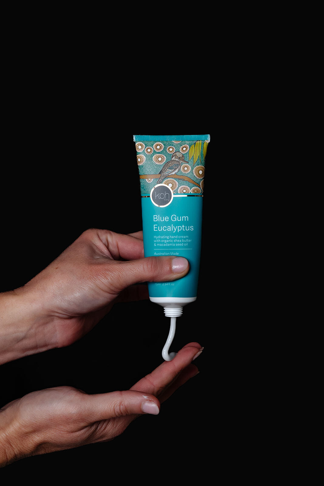 Hydrate your skin with Koh's Blue Gum & Eucalyptus Hand Cream. Enriched with Blue Gum & Eucalyptus sourced from Australia's coastal rainforests, indulgent almond oil, and shea butter, the creamy consistency of this product seeps into the skin for instant relief and a satisfying silkiness.