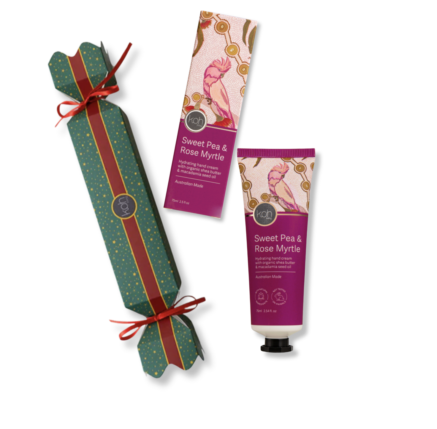 Make your festive celebrations even more special with the Christmas Bonbon Box. Designed to add joy and excitement to your holiday gatherings, this beautifully crafted box contains Koh's Sweet Pea & Rose Myrtle Hand Cream. Enriched with Sweet Pea & Rose Myrtle sourced from Australia's coastal rainforests, indulgent almond oil, and shea butter, the creamy consistency of this product seeps into the skin for instant relief and a satisfying silkiness.