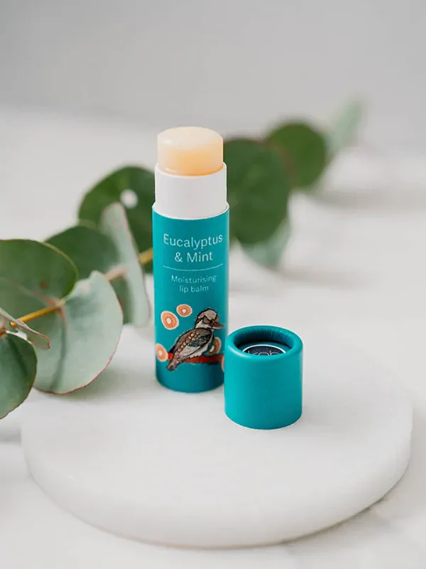 Soothe and refresh your lips with the natural essence of the Eucalyptus & Mint in this all natural Lip Balm. With fresh new artwork "Kookaburra Dreaming" by First Nations artist Domica Hill, this luxurious lip balm combines nourishing ingredients with the invigorating eucalyptus with the sweet freshness of mint, delivering hydration with a burst of freshness.