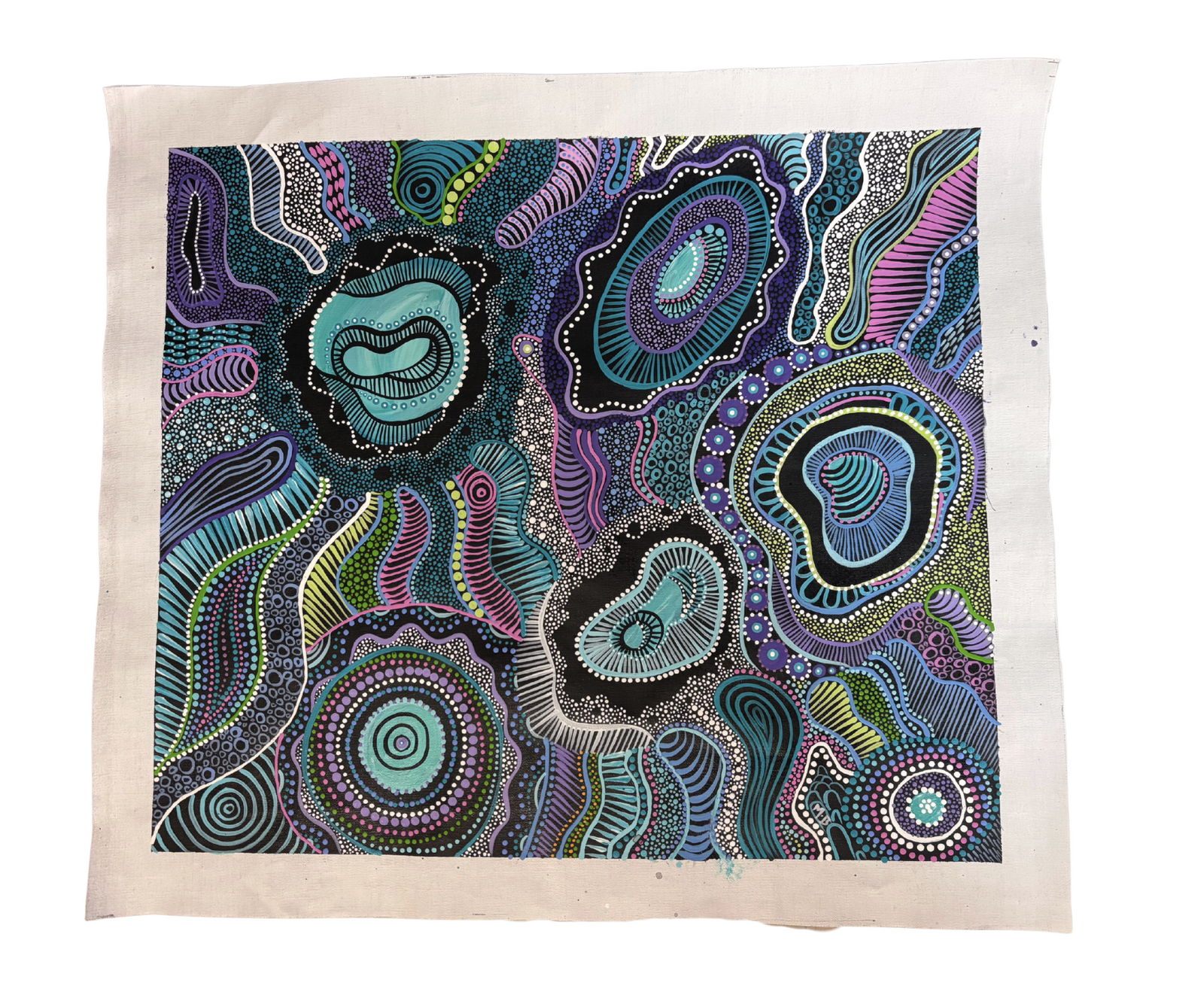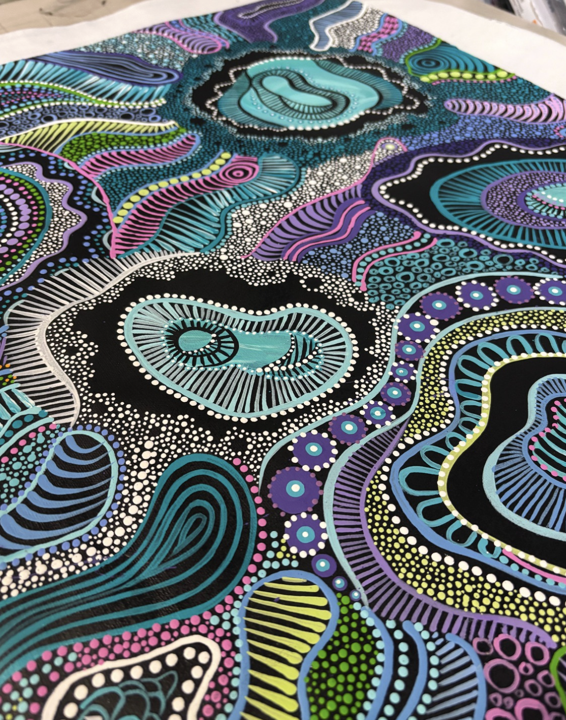 Her artworks are influenced from her ancestors, memories, feelings and dreams, transferred onto a canvas using a kaleidoscope of colours, brush strokes and dots to create a story. Some of Maree’s stories are very personal about her life, loss and grief. Maree also draws on her dreams that come to her in the night, dreaming of her ancestors and now are part of the stars and planets above.