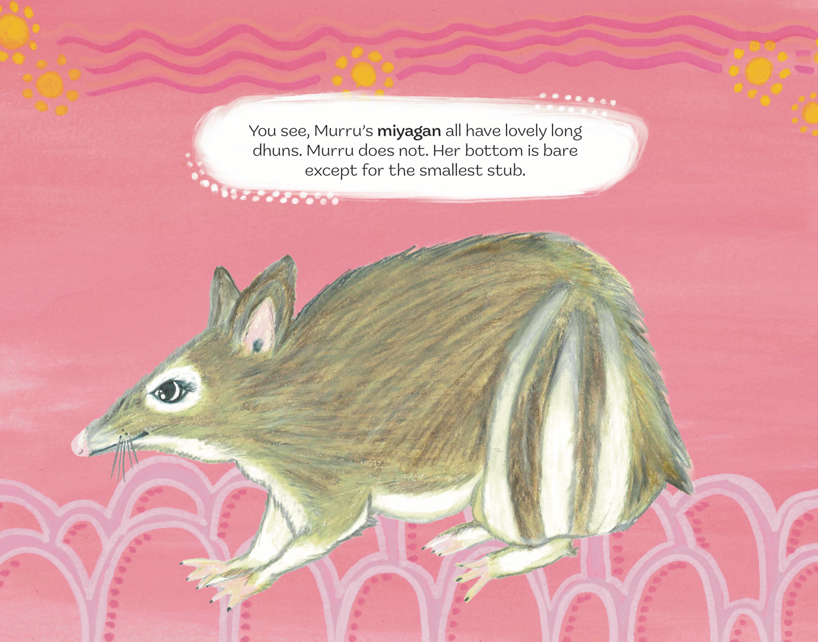 Little Murru is different from the other bandicoots, she has no dhun (tail). Tired of being teased, she sets off on a brave journey to ask Biame, the Sky Father, for help.
