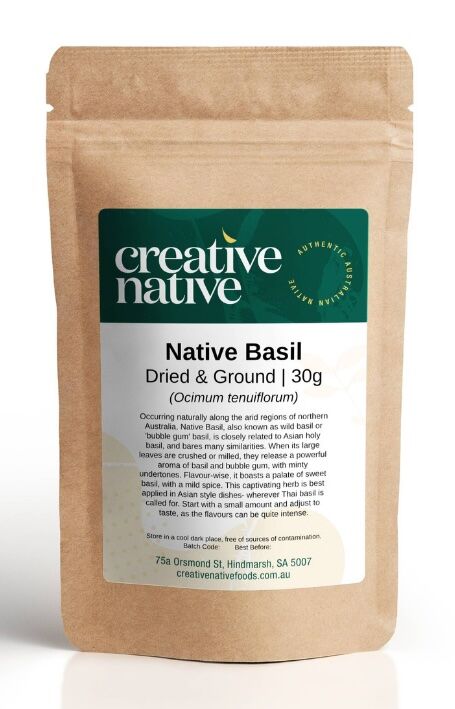Native Basil should be used sparingly, as its flavour can be quite potent. Start with a small amount and adjust to taste. Store in an airtight container, in a cool dark place.