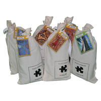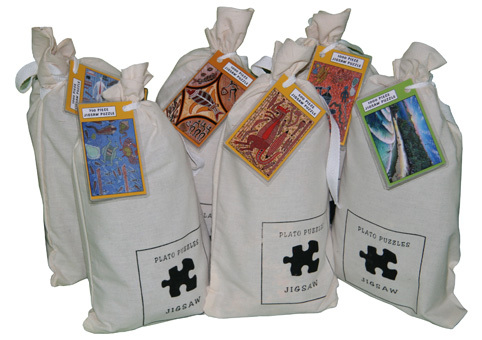 Plato Puzzles cardboard puzzles all come packaged in “Swag Bags”. These bags are made of 100% natural calico fibre, and are definitely superior to boxes, particularly in terms of storing the pieces safely and compactness. Every Swag Bag jigsaw comes with