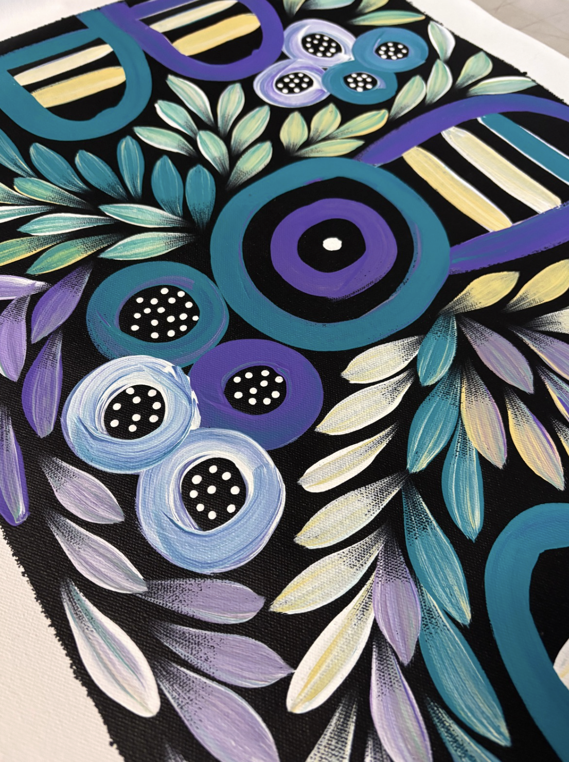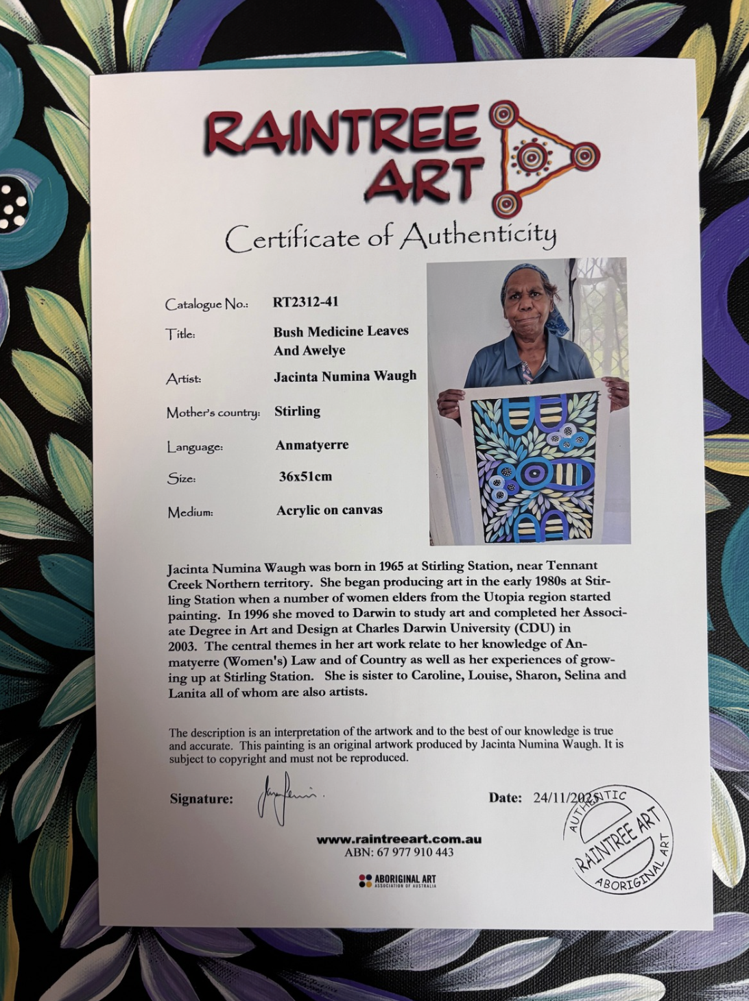 Jacinta is one of the celebrated Numina sisters, whose bold, confident, and colourful paintings are enjoyed in homes throughout Australia and all over the world. Her sisters are Sharon, Selina, Caroline, Louise and Lanita – and each of the Numina sisters are highly regarded Aboriginal Artists in their own right. Jacinta, her sisters and two brothers are the children of Barbara Pananka Price and the late Douglas Petyarre, and it was two of Douglas’ sisters – the internationally-renowned Aboriginal Artists Gloria and Kathleen Petyarre – who taught their nieces to paint the Bush Medicine Leaf ceremony (Aunty Gloria) and Thorny Lizard Dreaming (Aunty Kathleen). The Numina Sisters are also the great nieces of Emily Kngwarreye and Kudditji Kngwarreye, who along with Minnie Pwerle and Ada Bird Petyarre, are the most internationally acclaimed artists of the Aboriginal Art Movement of the Utopia Aboriginal Lands of the Eastern Desert that emerged in the 1970s.
