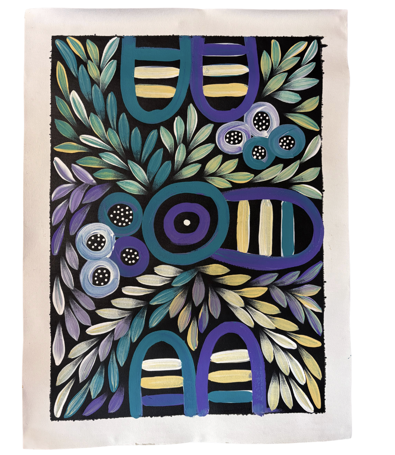 The central themes in Jacinta's work relate to her extensive knowledge of Anmatyerre (Women's) Law and of Country, as well as her experiences of growing up at Stirling Station.