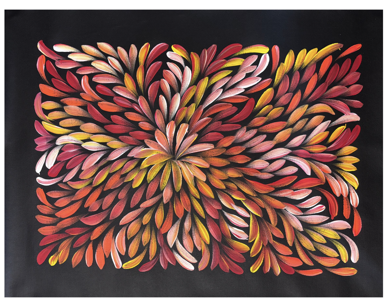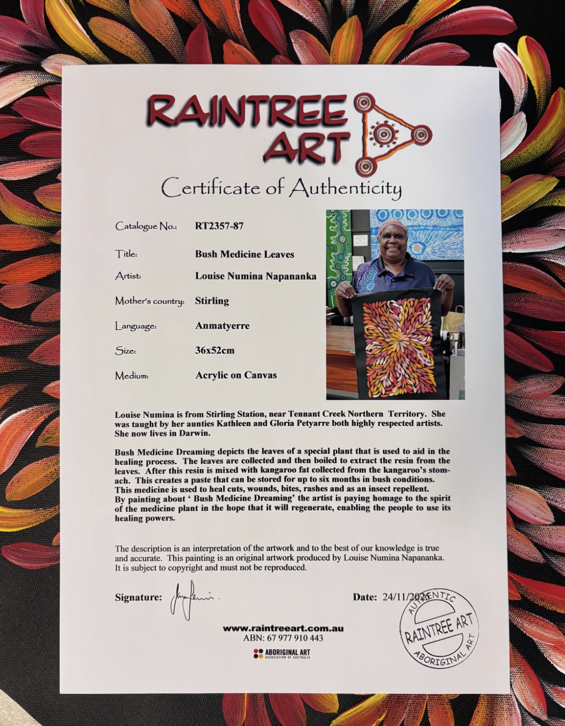 Louise is one of the celebrated Numina sisters, whose bold, confident, and colourful paintings are enjoyed in homes throughout Australia and all over the world. Her sisters are Sharon, Selina, Caroline, Jacinta and Lanita – and each of the Numina sisters are highly regarded Aboriginal Artists in their own right. Louise, her sisters and two brothers are the children of Barbara Pananka Price and the late Douglas Petyarre, and it was two of Douglas’ sisters – the internationally-renowned Aboriginal Artists Gloria and Kathleen Petyarre – who taught their nieces to paint the Bush Medicine Leaf ceremony (Aunty Gloria) and Thorny Lizard Dreaming (Aunty Kathleen). The Numina Sisters are also the great nieces of Emily Kngawarreye and Kudditji Kngawarreye, who along with Minnie Pwerle and Ada Bird Petyarre, are the most internationally acclaimed artists of the Aboriginal Art Movement of the Utopia Aboriginal Lands of the Eastern Desert that emerged in the 1970s.