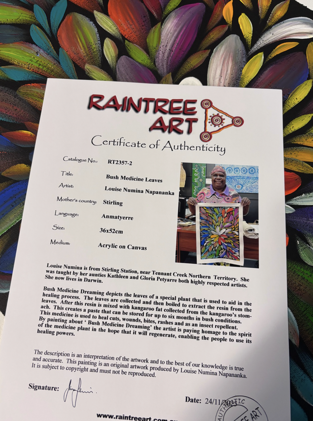 Louise is one of the celebrated Numina sisters, whose bold, confident, and colourful paintings are enjoyed in homes throughout Australia and all over the world. Her sisters are Sharon, Selina, Caroline, Jacinta and Lanita – and each of the Numina sisters are highly regarded Aboriginal Artists in their own right. Louise, her sisters and two brothers are the children of Barbara Pananka Price and the late Douglas Petyarre, and it was two of Douglas’ sisters – the internationally-renowned Aboriginal Artists Gloria and Kathleen Petyarre – who taught their nieces to paint the Bush Medicine Leaf ceremony (Aunty Gloria) and Thorny Lizard Dreaming (Aunty Kathleen). The Numina Sisters are also the great nieces of Emily Kngawarreye and Kudditji Kngawarreye, who along with Minnie Pwerle and Ada Bird Petyarre, are the most internationally acclaimed artists of the Aboriginal Art Movement of the Utopia Aboriginal Lands of the Eastern Desert that emerged in the 1970s.