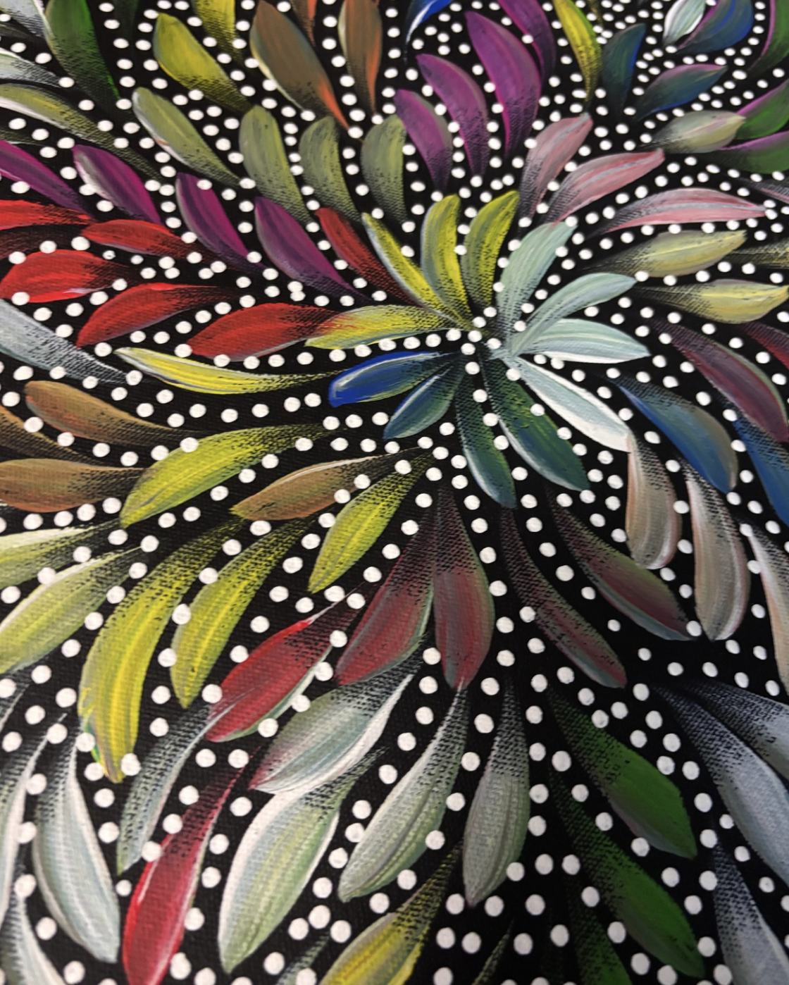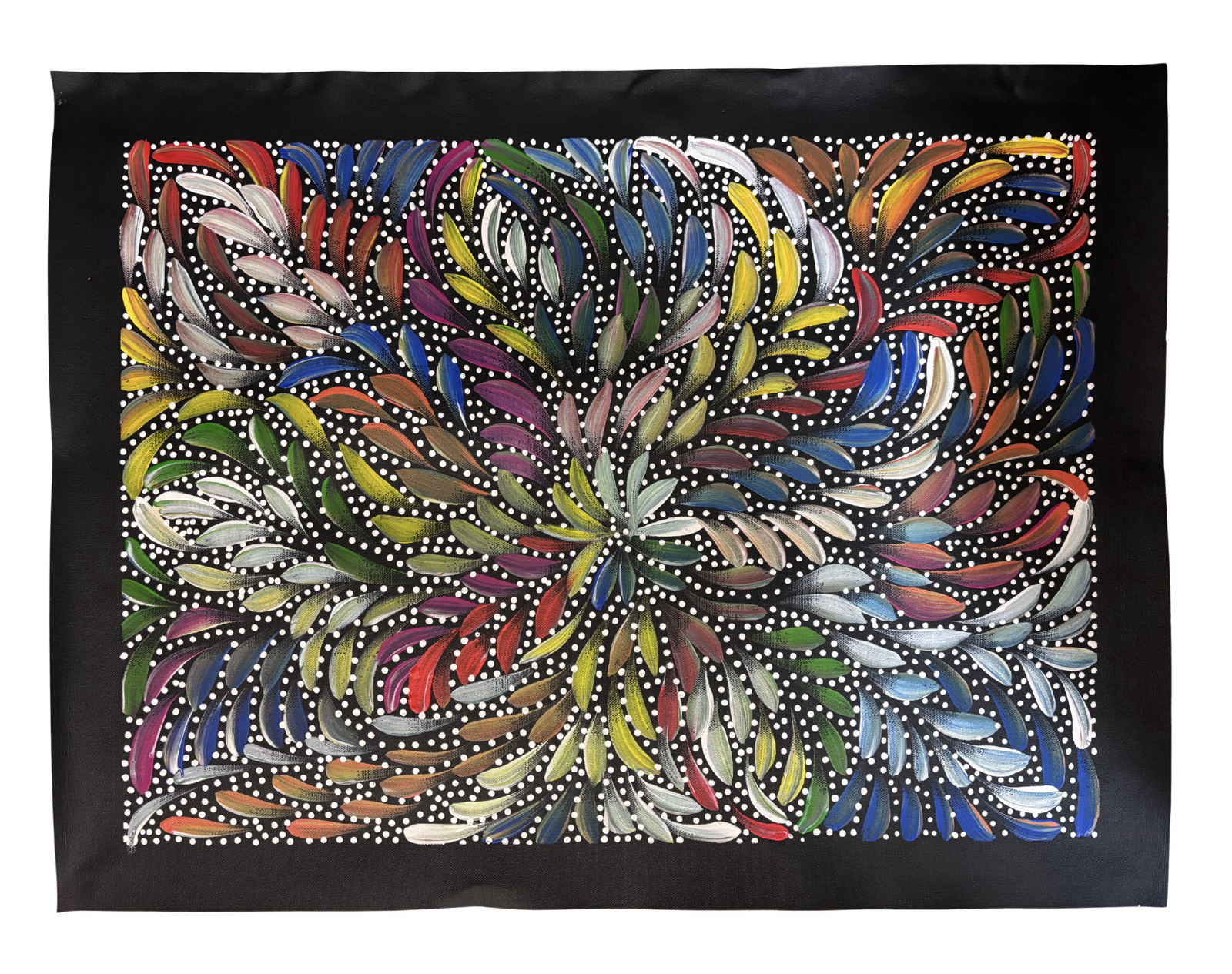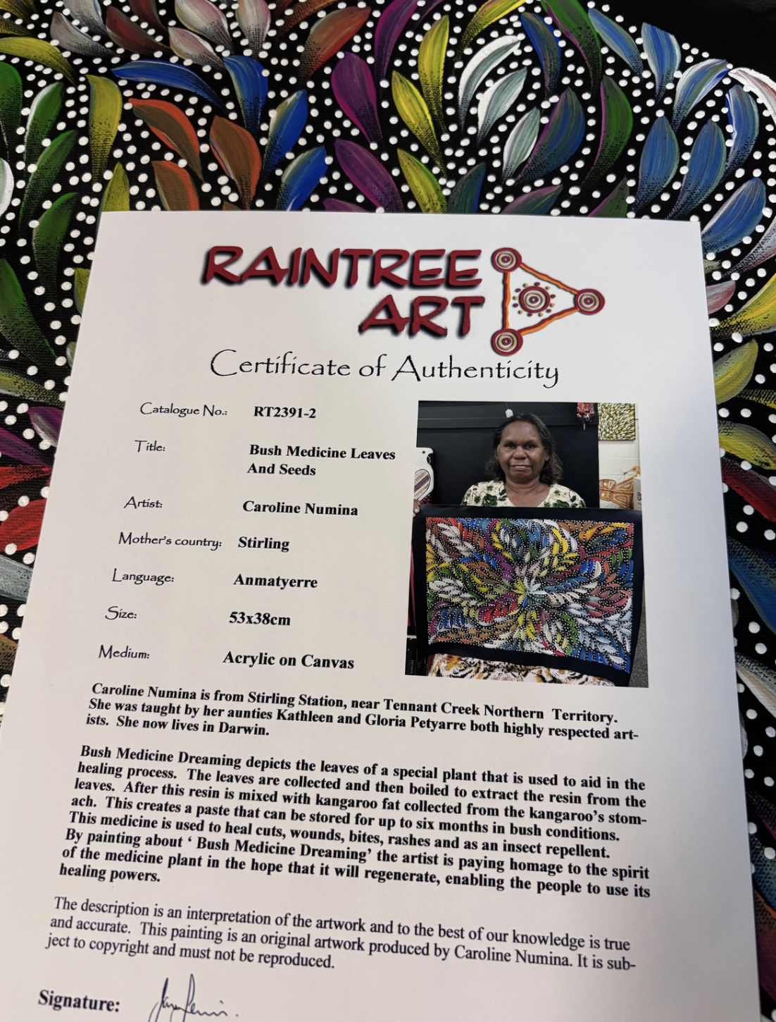 Caroline is one of the celebrated Numina sisters, whose bold, confident, and colourful paintings are enjoyed in homes throughout Australia and all over the world. Her sisters are Sharon, Selina, Louise, Jacinta and Lanita – and each of the Numina sisters are highly regarded Aboriginal Artists in their own right. Caroline, her sisters and two brothers are the children of Barbara Pananka Price and the late Douglas Petyarre, and it was two of Douglas’ sisters – the internationally-renowned Aboriginal Artists Gloria and Kathleen Petyarre – who taught their nieces to paint the Bush Medicine Leaf ceremony (Aunty Gloria) and Thorny Lizard Dreaming (Aunty Kathleen). The Numina Sisters are also the great nieces of Emily Kngwarreye and Kudditji Kngwarreye, who along with Minnie Pwerle and Ada Bird Petyarre, are the most internationally acclaimed artists of the Aboriginal Art Movement of the Utopia Aboriginal Lands of the Eastern Desert that emerged in the 1970s.