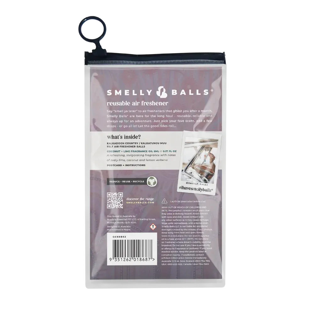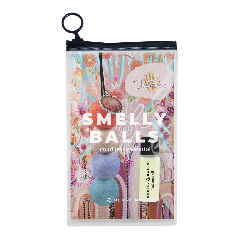 Contains: 4 Unscented Ethically Sourced Wool Felt Balls with Chern'ee Sutton Artwork charm and elastic string for easy hanging. Includes 5mL Fragrance Oil to scent the balls PLUS Postcard with instrutions and Reusable Plastic Pouch