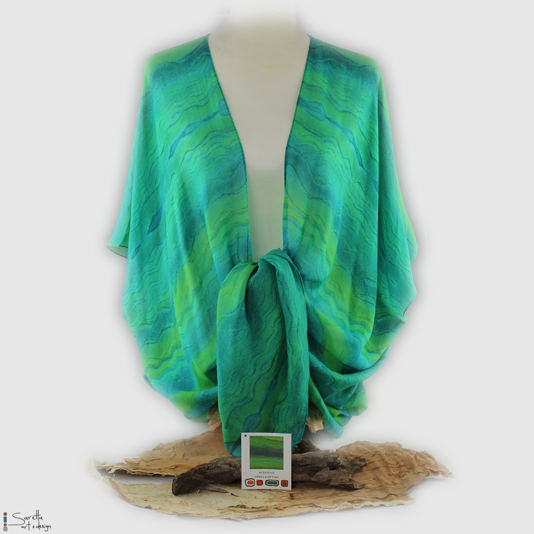 These stunning open kaftan designs are created for you from fine artworks by renowned Indigenous artist Saretta Fielding. Combine a sophisticated drape shape and breezy open front with a stunning artwork print for easy elegance!