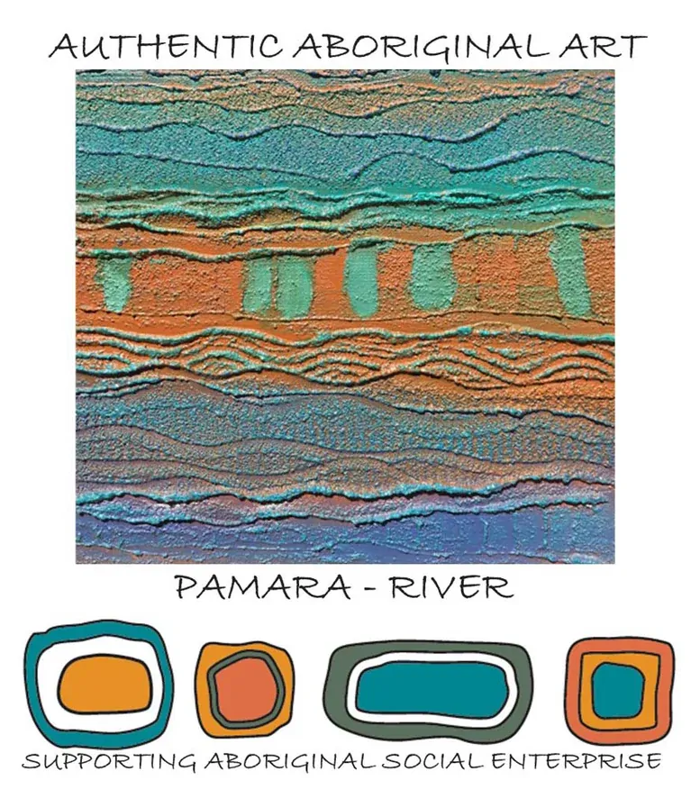 Blue shades and hues flowing across this artwork reflect the trails made by rivers across country. Rivers provided an abundance of resources for Aboriginal people and made easy travel routes by canoe.