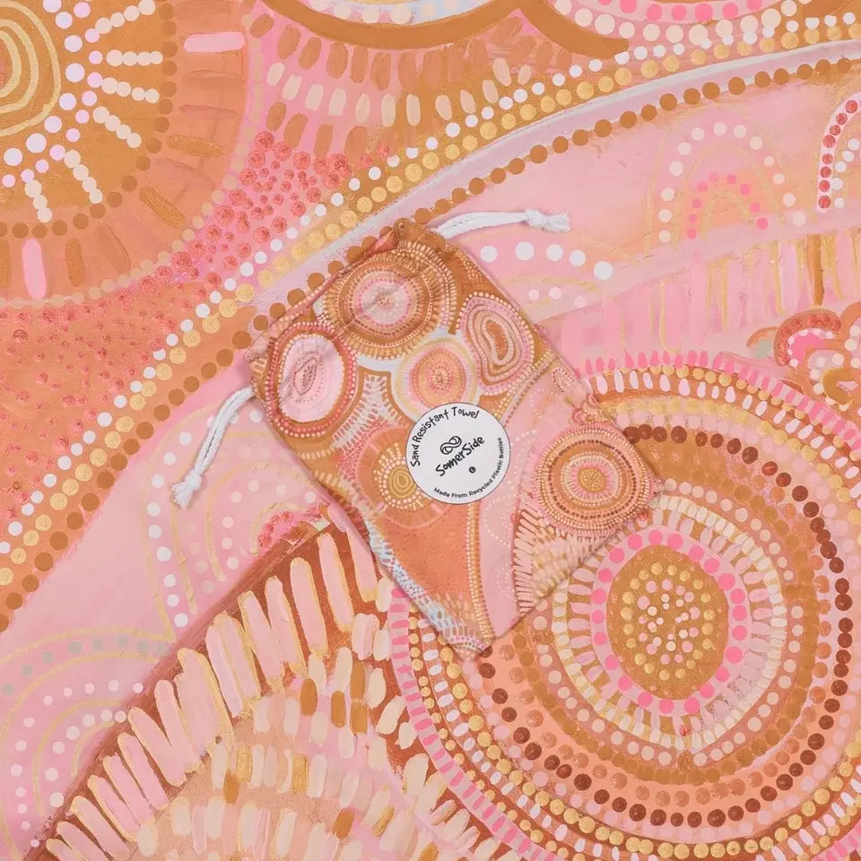 SomerSide towels are made from 85% recycled plastic bottles. The plastic bottles are made into Polyester and the remaining 15% is Nylon which provides the absorbency and softness. The pouch is made from the same material.