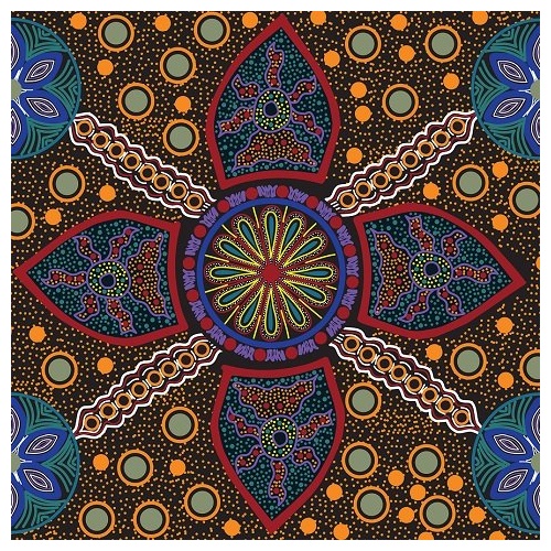 Stella is a monument of sculptural stone ware introduced by Maya civilization of ancient Meso america. They consist of tall sculptured stone shaft and are often associated with low circular stones referred to as altars. Cathy Turner is a skilled and experienced Aboriginal artist. Her imaginative mind led her to depict Stella in her artwork wonderfully. It is colorful, vibrant with full of minute details. Stella design on fabric is very popular to our costumer.