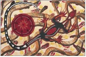 This painting tells how the goanna circles the nest of the king brown serpent in preparation for battle