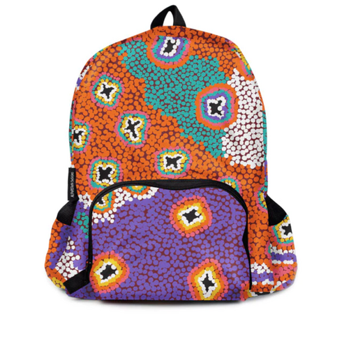 Fold up backpack features Aboriginal Artwork by Ruth Napaljarri Stewart, from Warlukurlangu Artists. Established in 1985 Warlukurlangu Artists Aboriginal Corporation is a not-for-profit organisation that is 100% Aboriginal-owned by its artists from the remote desert communities of Yuendumu and Nyirripi in Central Australia.