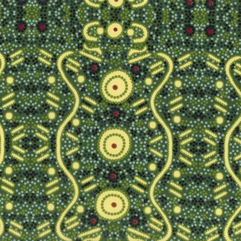 Audrey Napanangka is a very well-known Artist. Many of her art works have been printed on textile materials by M&S Textiles Australia. She skilfully painted her dreaming; i.e. Water Dreaming. In Desert areas of Australia, it is hard to find water. 90% of water comes from underground. Audrey’s experience in the bush tells her where and how to find drinking water in the waterholes. The long curved lines indicate the movement of water in the area. Dotted lines and smaller circles indicate various soakage’s, broken roads, sands, etc.