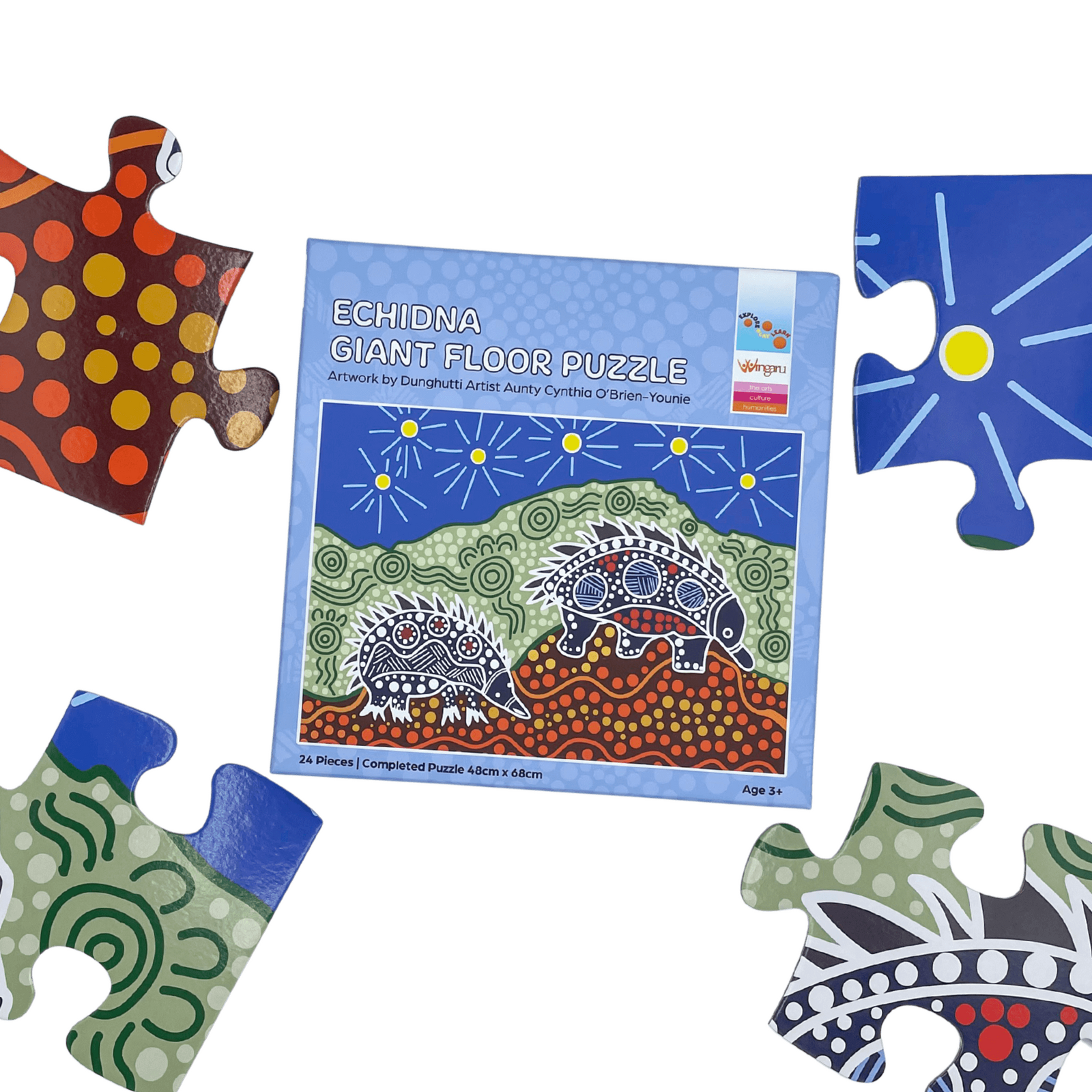 Celebrate Aussie animals and their surroundings with our 24-piece giant floor puzzle featuring stunning artwork by Dunghutti Artist Aunty Cynthia O’Brien-Younie. Perfect for everyday mindful moments, these puzzles encourage problem-solving, hand-eye coordination, and fine motor skills while inspiring curiosity about Australian wildlife and Aboriginal art