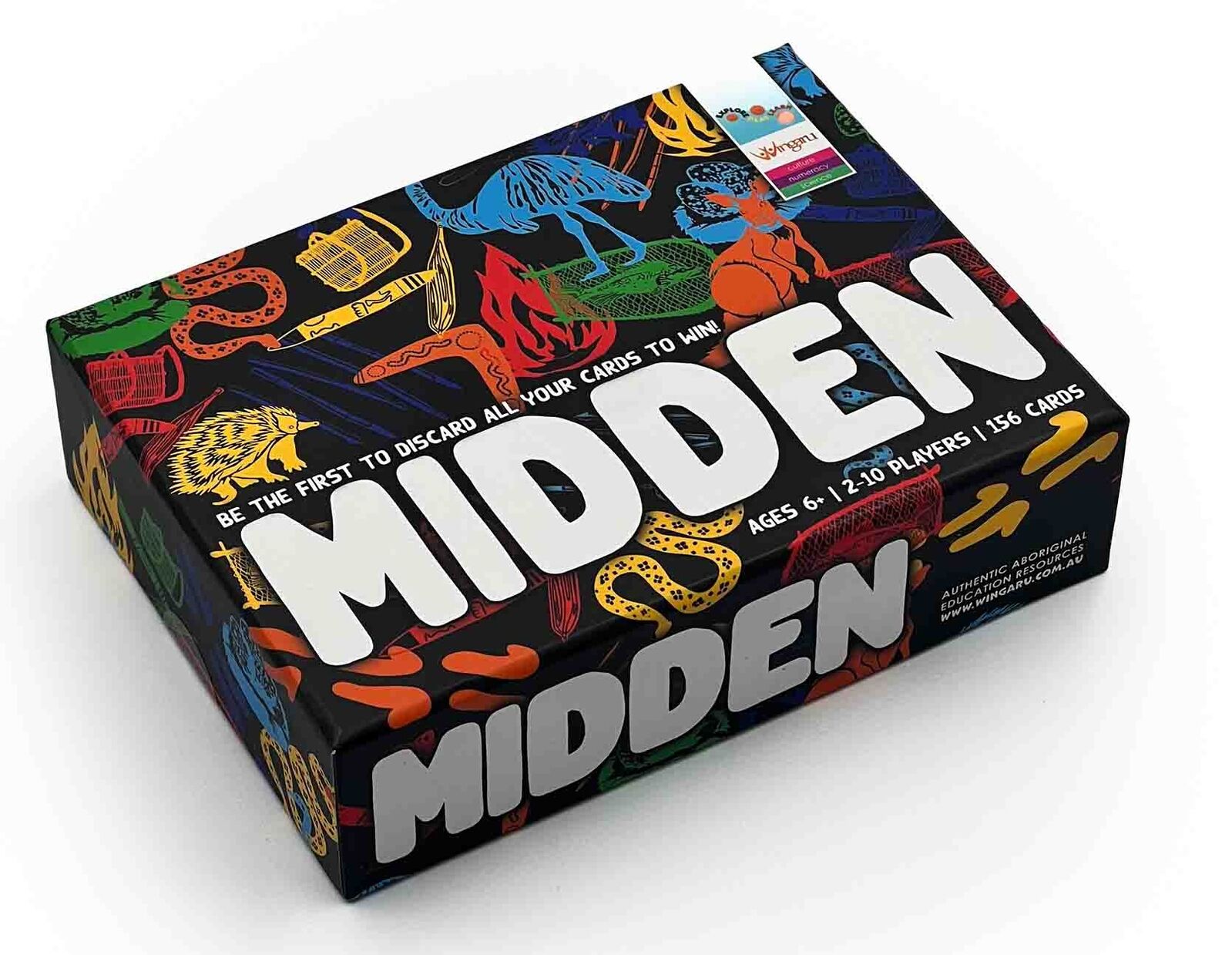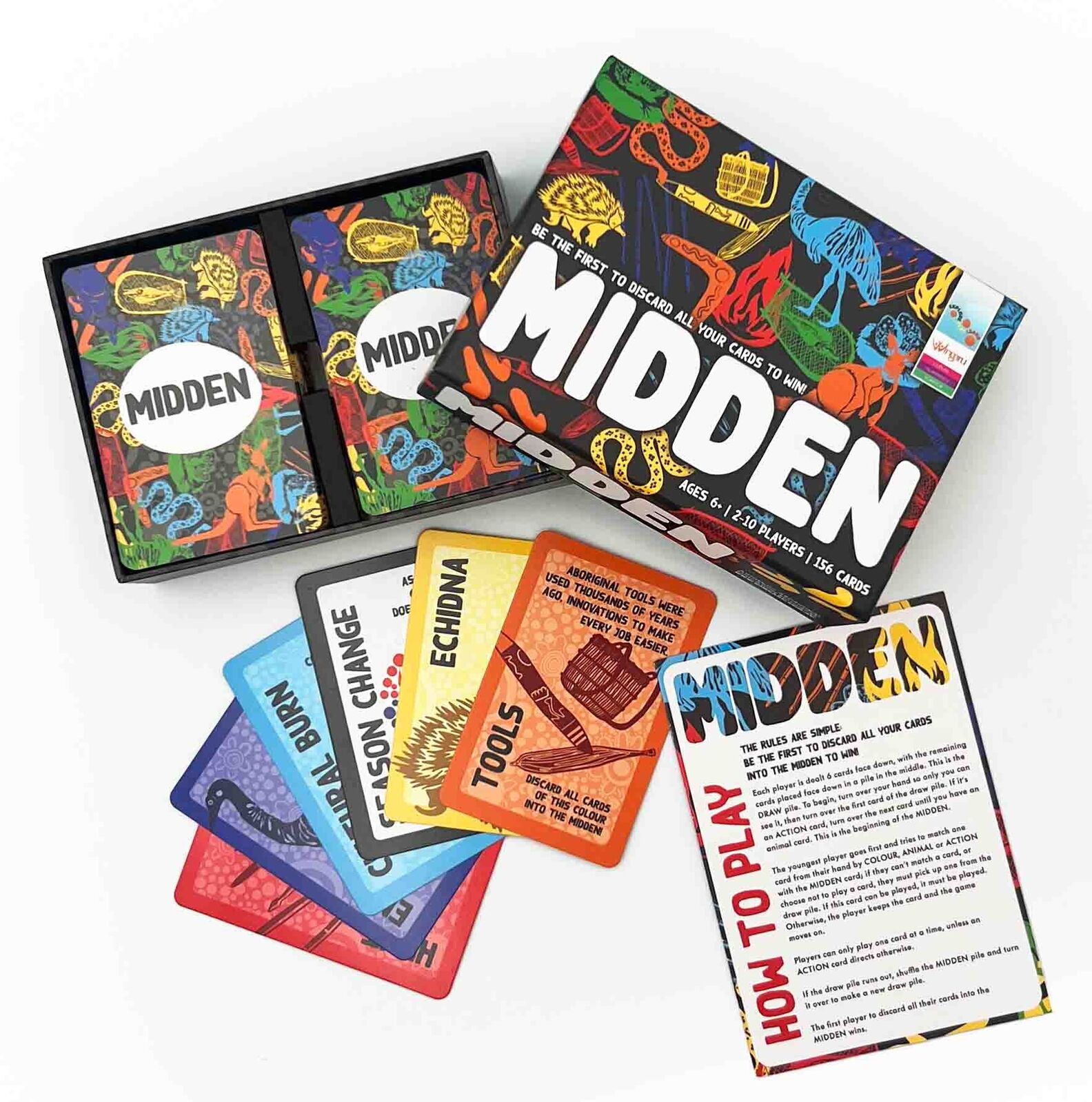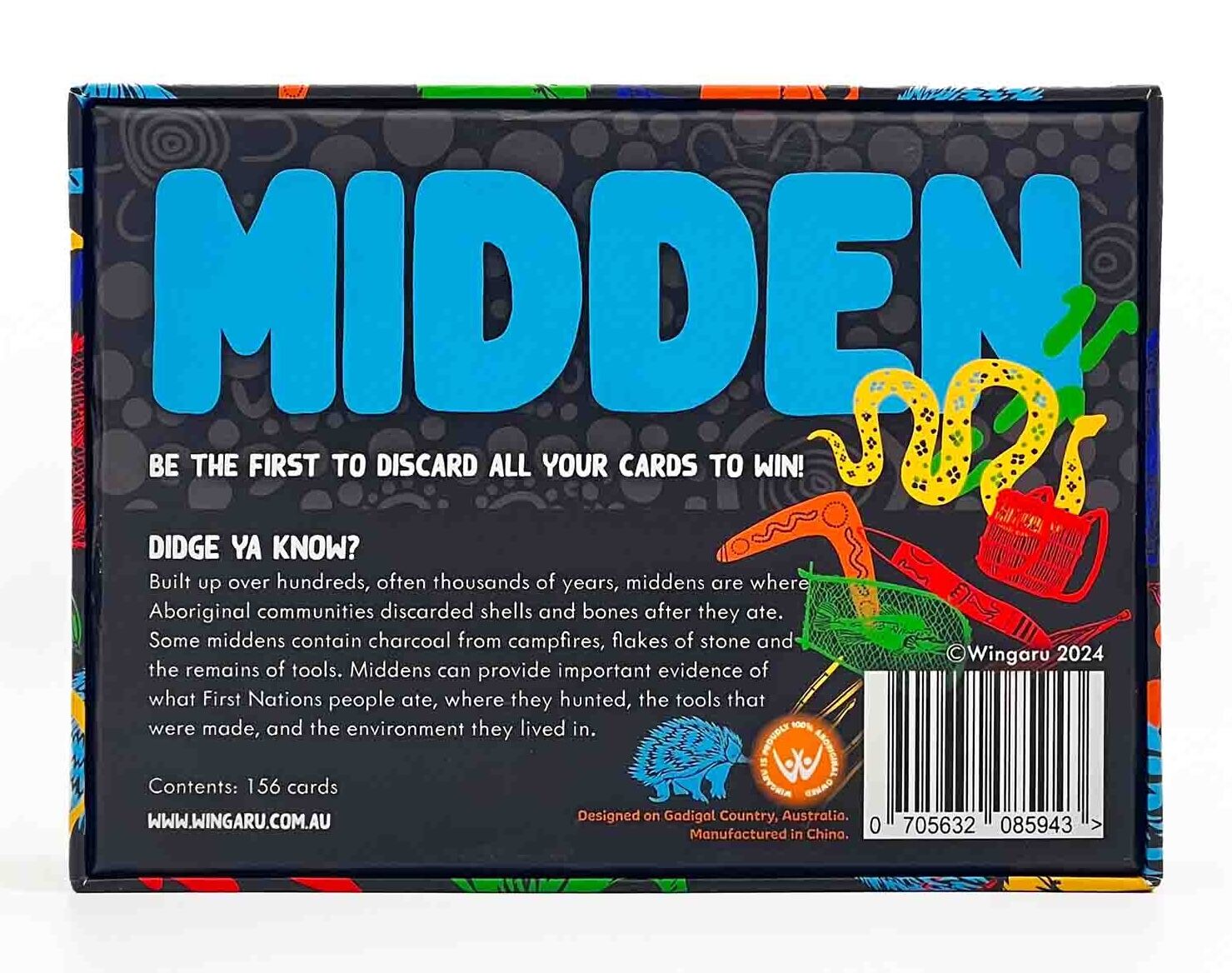 Showcasing elements from traditional Aboriginal culture, Midden is a fast paced, action packed card game that encourages understanding of Aboriginal principles related to caring for Country, bush tucker and traditional tools.